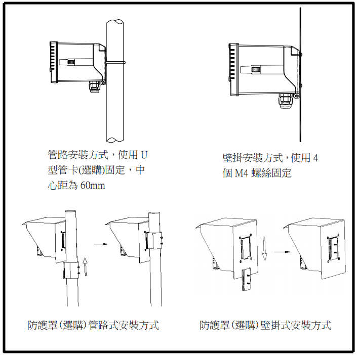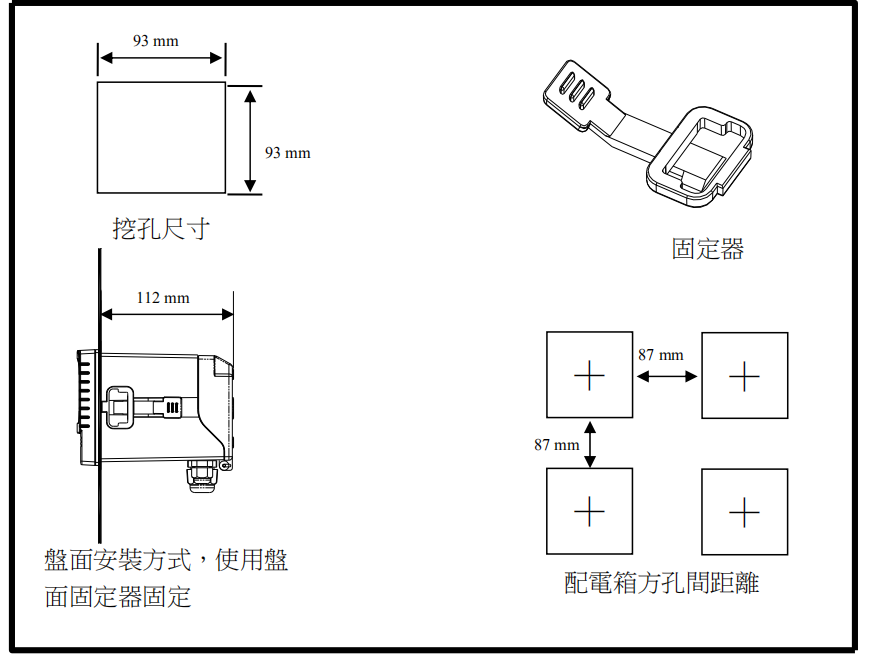 1 主機固定 EC-4300RS傳送器可盤面式、2 吋管式、壁掛式安裝,盤面式安裝請預先在配電箱面板上留一93 mm x 93 mm 的方孔,傳送器從配電箱之面板直接放入,將傳送器所附之固定器由後方套入,卡進固定槽內。