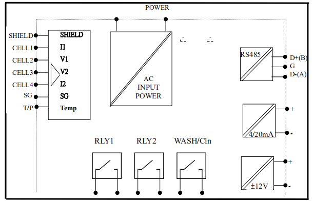 3 背板端子接點說明 REL1:第一點警報控制,外接繼電器接點。 REL2:第二點警報控制,外接繼電器接點。 WASH:外接清洗裝置繼電器接點。 NC:空腳。 Power(N):100~240AC 電源接線端。 NC:空腳。 Power(L):100~240AC 電源接線端。 SHIELD:接電極訊號線之透明線。 CELL1:接電極訊號線之 Current electrode 1。 CELL2:接電極訊號線之 Voltage electrode 1。 CELL3:接電極訊號線之 Voltage electrode 2。 CELL4:接電極訊號線之 Current electrode 2。 SG:NC。 TP:接電極訊號線之溫度線。 SG:NC。 4~20mA+端:主測量電流輸出接點+端,供外接記錄器或 PLC 控制。 4~20mA-端:主測量電流輸出接點-端,供外接記錄器或 PLC 控制。 4~20mA+端 / D+(B):RS-485 輸出之 D+(B)。 4~20mA -端 / G:RS-485 輸出之 GND。 NC / D-(A): RS-485 輸出之 D-(A)。