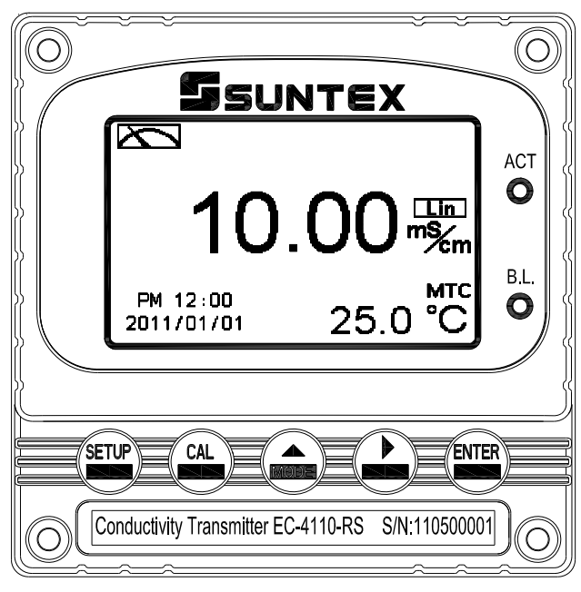 2 按鍵說明 EC-4300RS為防止非使用人員之不當操作,在進入參數設定與校正時,皆採複合鍵操作,並可啟用密碼保護,各鍵功能說明如下: SETUP:於參數設定模式時,按本鍵回到上一層設定選項/動作,連續按本鍵返回測量模式 CAL:於校正模式時,按本鍵回到上一層校正設定選項/動作,連續按本鍵返回測量模式 MODE:1.於參數設定及校正模式下為向左選擇項目或切換頁面。 2.在調整數值時,本鍵為向上調整數字大小。 >:1.於參數設定及校正模式下為向右選擇項目或切換頁面。 2.在調整數值時,本鍵為向下調整數字大小。 ENTER:確認先前的操作程式或設定為正確,按本鍵確認並進入下一程式或設定。