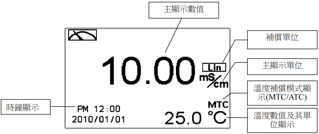 測量顯示模式 1 一般模式 一般模式為文數字顯示,顯示內容如下圖所示,包括主顯示數值及其單位顯示,溫度數值及其單位顯示,溫度補償模式,時鐘顯示。