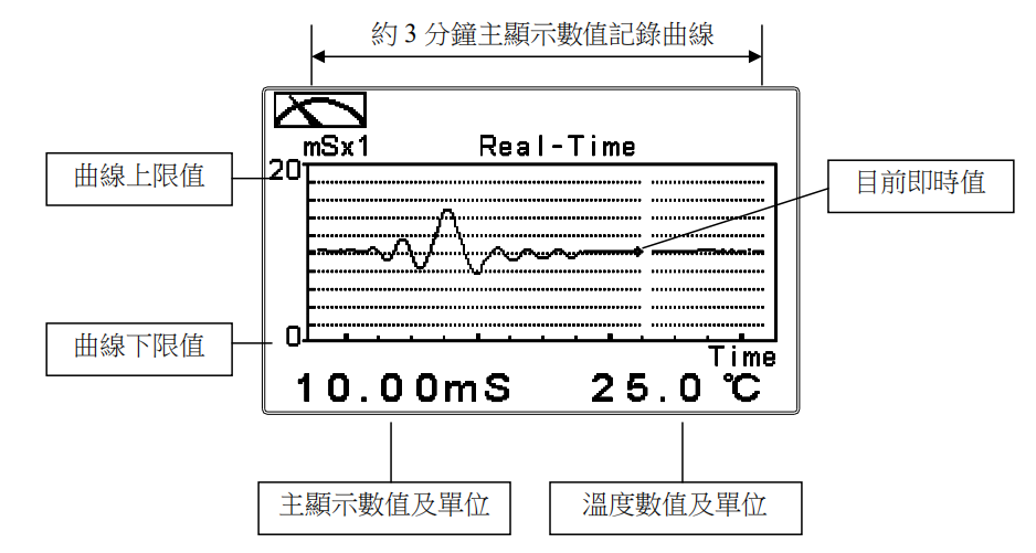 2 即時圖形模式(Real-Time Chart mode) 即時圖形模式為即時動態顯示最近三分鐘的測值變化曲線,使用者可於設定模式設定其對應 Cond/Res 測量範圍(請參考 7.4 章節),範圍設定越小,則顯示之解析度越高。當進入設定或校正模式後返回測量模式,圖形將重新更新。當測值超過設定範圍上下限時,圖形將以虛線方式呈現在上下限值,即時圖形模式顯示內容如下圖所示,螢幕下方並顯示即時的主顯示數值及其單位,溫度數值及其單位。